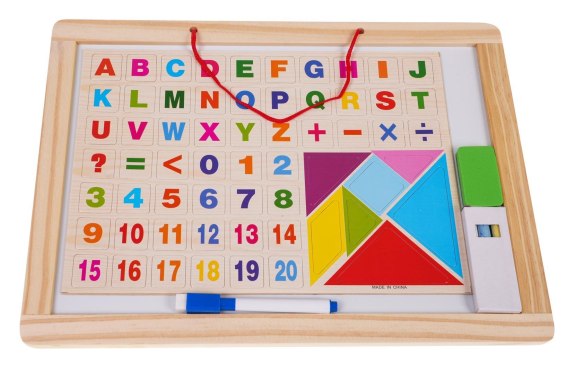 Drewniana, dwustronna tablica z akcesoriami dla dzieci od 3-go roku życia. Z jednej strony tablica jest czarna do malowania kredą, a z drugiej biała do pisania pisakami suchościeralnymi. W zestawie znajduje się również kreda, pisak suchościeralny, gąbka i magnesy z literkami i cyferkami oraz figury geometryczne.
