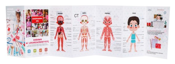 - drewniana ruchoma strzykawka 13.5x4x2.5cm, - drewniane nożyczki 11.5x6x1cm, - metalowy stetoskop, - drewniany syrop z odczepianą nakrętką 7x4x4cm, - drewniana imitacja maści 10x3x3cm, - drewniany termometr ze zmiennymi wskaźnikami temperatury 12x3x1.5cm, - 2x drewniane imitacje kapsułek 4x3x1cm, - 4x drewniane imitacje tabletek 2.5x2.5x1.5cm, - 2x drewniana imitacja tabletek 4x2.5x0.5cm, - drewniany identyfikator w kształcie misia 12x8x0.5cm, - plastikowy identyfikator wraz ze smyczą, - drewniana imitacja kropli wraz z drewnianą pipetką 8x4x4cm, - drewniana pęseta 10x1.5x1.5 cm, - drewniana podstawa wraz z wymiennymi karteczkami z informacją o stanie pacjenta + ołówek 18x13x0.5cm, - 5x plastry 7x2cm, - 3x naklejka „dzielny pacjent" w języku polskim 5x5cm, - 3x naklejka „dzielny pacjent" w języku angielskim 5x5cm, - drewniane walizka z metalowym zamknięciem i wygodnych uchwytem 25.5x20x9.5cm, - książeczka w języku polskim i angielskim ucząca dzieci budowy ciała człowieka (narządy, kości, mięsnie, ciało), - książeczka w języku polskim i angielskim ucząca dzieci w jaki sposób zachowywać się u danych lekarzy wraz ze wskazówkami .