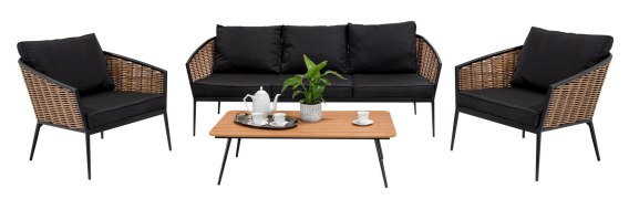 Konstrukcja wszystkich elementów zestawu osadzona została na ALUMINIOWYCH stelażach, gwarantując zestawowi lekkość i odporność na warunki atmosferyczne. Dzięki zastosowaniu wysokiej klasy aluminium komplet mebli ogrodowych jest całkowicie odporny na korozję.