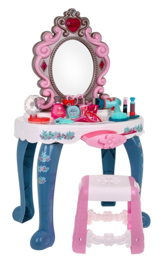 Interaktywna toaletka z lustrem, taboretem i akcesoriami dla małej księżniczki od trzeciego roku życia. Zabawka posiada funkcję dźwięku (trzy melodie) i światła (serduszko nad lustrem i dwa diamenciki po bokach lustra). Zabawka zasilana bateriami typu 2 x AA 1,5V (brak w zestawie). Wszystkie kosmetyki dołączone do zestawu są atrapami.
