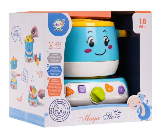 Kuchenka posiada efekty dźwiękowe i świetlne, wydaje odgłosy gotowania wody w czajniku, gotowania potrawy, smażenia, zapalania gazu, wesołe melodyjki, podczas odgłosów mrugają się światełka po bokach kuchenki. Garnek dołączony do kuchenki jest zarazem sorterem, dziecko musi dopasować klocuszki do otworów, nie jest to łatwe zadanie, ale gdy już mu się to uda odczuje dumę, zadowolenie i satysfakcje. Zabawka zasilana jest bateriami typu 2 x AA 1,5V (których brak w zestawie).