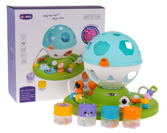 Interaktywny, edukacyjny, sorter o tematyce kosmosu dla maluszków od 18-go miesiąca życia. Sorter wykonany został z najlepszej jakości plastiku w żywych kolorach, przyciągających wzrok maluszka. Zabawka składa się z podstawki, na którejznajdują się kółeczka zębate do kręcenia, labirynty do pokonania i przekładanki. Na podstawce jest również okrągły sorterz otworami w kształcie figur geometrycznych. Maluszek musi przypasować klocuszki znajdujące się w zestawie do odpowiednich kształtów na sorterze. Po dopasowaniu wszystkich klocków sorter można otworzyć i zabawę rozpocząć na nowo. W zestawie znajdują się 4 klocuszki. Dodatkowo każdy z nich w środku posiada małe kuleczki, które sprawiają, że klocuszek grzechocze. Sorter posiada również funkcję światła i dźwięku, z wnętrza kuli wydobywa się gwiezdny blask i słychać melodie. Zabawa tym sorterem uczy maluszka dopasowywać i kategoryzować według kształtu i koloru. Poprawia zdolności poznawcze i motoryczne. Dziecko poznaje przyczynę i skutek oraz doskonali umiejętności rozwiązywania problemu. Zabawka zasilana jest bateriami typu 3 x AA 1,5 V (brak w zestawie).