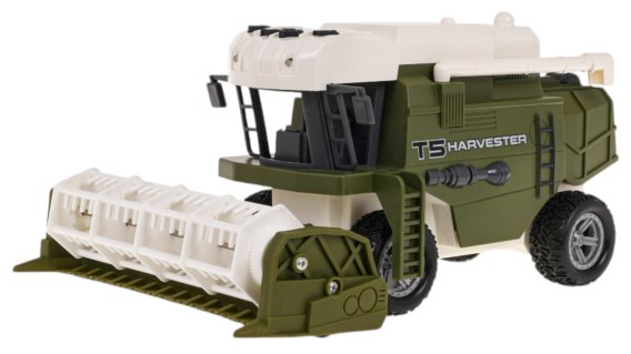 Interaktywny kombajn z napędem oraz funkcją dźwięku i światła dla dzieci powyżej 3-go roku życia. Zabawka posiada na dachu cztery przyciski dźwiękowe, po naciśnięciu których wydaje odgłos odpalania, pracy silnika, odgłosy zwierząt oraz klaksonu. Kombajn wykonany został z najlepszej jakości materiałów, posiada duże gumowe koła z napędem. W przedniej, górnej części pojazdu świecą się lampki. Zabawka zasilana jest bateriami typu 3 x AG13 (w zestawie).