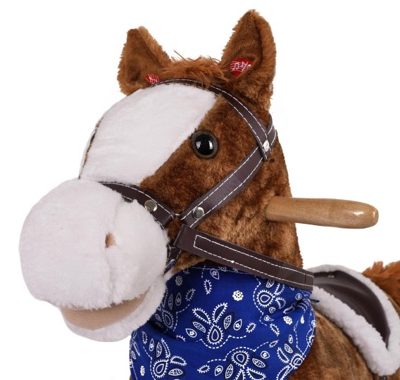 Pluszowy koń na biegunach z efektami dźwiękowymi dla dzieci od 3-go roku życia. Koń z pewnością przypadnie do gustu każdemu malcowi. Jest mięciutki w dotyku, posiada siodło z ekoskóry ze strzemionami, lejce i chustę na szyi. Na prawym i lewym uchu konia znajdują się czujniki, które uruchamiają odgłosy rżenia i galopu, poruszają ogonem i mordką. Zabawka zasilana jest bateriami typu 3 x AA 1,5V, baterii brak w zestawie.