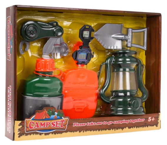 Zestaw kempingowy dla dzieci od 3-go roku życia. W skład zestawu wchodzi: lampa, manierka, niezbędnik, zegarek, pojemnik na żywność oraz łopatka. Z tym zestawem dziecko poczuje się jak prawdziwy odkrywca. Lampa zasilana jest bateriami typu 3 x AG13 (w zestawie).