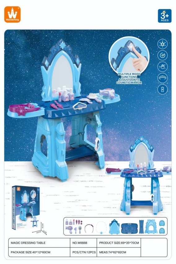 Interaktywna toaletka z funkcją dźwięku i światła to propozycja dla dzieci od 3-go roku życia. W zestawie znajduje się toaletka oraz atrapy kosmetyków i biżuterii. Toaletka posiada duże lusterko, a nad nim znajduje się przycisk w kształcie gwiazdki, po wciśnięciu którego uruchamiają się efekty dźwiękowe i świetlne. Na blacie i półeczkach po bokach toaletki umiejscowiono wgłębienia na kosmetyki i biżuterię. Półeczki po bokach można również otwierać jak okiennice.Toaletka zasilana jest bateriami typu 2 x AAA 1,5 V (brak w zestawie).