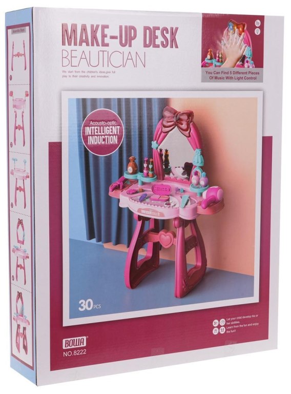 Bogato wyposażona toaletka z mnóstwem akcesoriów z funkcją światła i dźwięku dla dzieci od 3-go roku życia. Toaletka wykonana została z najlepszej jakości plastiku w bogatych kolorach. Zasilana jest bateriami typu 3 x AA 1,5 V (baterii brak w zestawie). Kokardka znajdująca się nad lustrem posiada czujnik, który pod wpływem ruchu uruchamia efekty świetlne w postaci mrugających światełek oraz efekty dźwiękowe w postaci wesołych melodii.