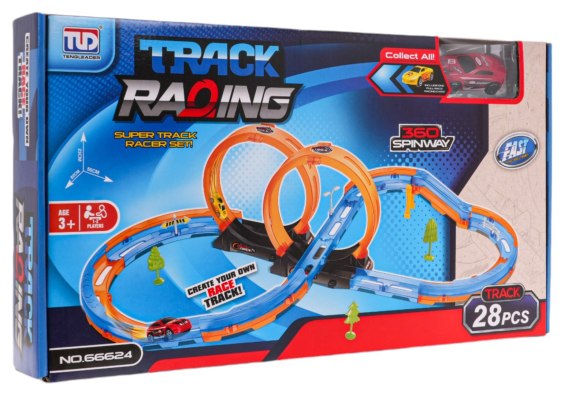 Tor wyścigowy z pętlami 360 stopni, dla dzieci od 3-go roku życia. Tor wykonano z najlepszej jakości plastiku w żywych kolorach. Na zestaw składa się 28 elementów do samodzielnego montażu. Tor posiada odcinki proste do rozpędzenia pojazdu, 2 pętlę 360 stopni i pojazd. Pojazd posiada napędem pull back. Wystarczy delikatnie nacisnąć pojazd do tyłu, by przejechał tor z pełną mocą.