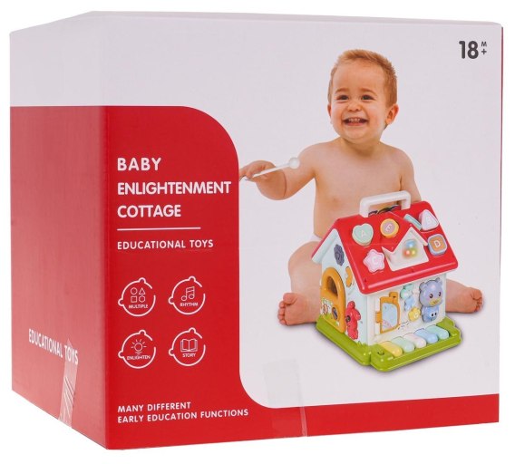 Interaktywny, edukacyjny domek dla dzieci od 18-go miesiąca życia. Domek wykonany został z najlepszej jakości plastiku, w żywych kolorach, przyciągających wzrok dziecka i zachęcających do edukacyjnej zabawy. Domek stoi na zielonej trawce, posiada 4 ściany oferujące różne atrakcje, czerwony daszek oraz rączkę do przenoszenia. Zabawka zasilana jest bateriami typu 3 x AA 1,5 V (brak w zestawie).
