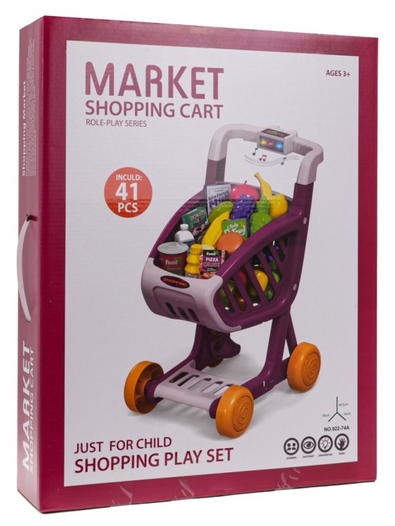 Interaktywny wózek sklepowy z funkcją dźwięku i światła dla dzieci od 3-go roku życia. Wózek wykonano z materiałów najlepszej jakości, jest stabilny, ma obrotowe kółka i rączkę, na której znajduje się panel z dźwiękami i światłami. Po wciśnięciu niebieskiego przycisku zaczynają migotać 3 diody (zielona, czerwona, niebieska) oraz słychać wesołe piosenki. Zabawka zasilana jest bateriami typu 3 x AG13 (w zestawie).