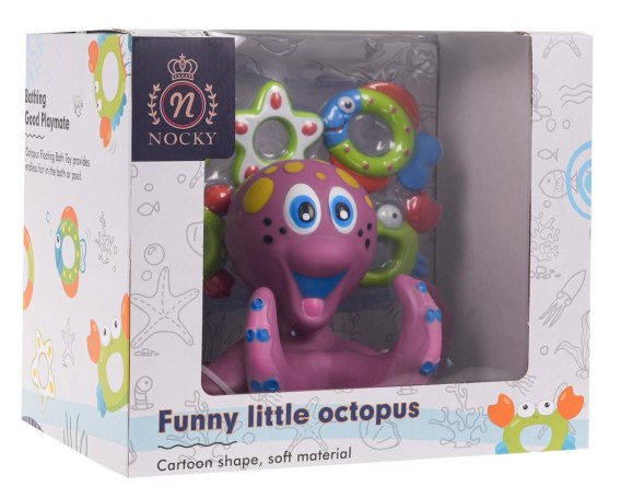 Zabawka do kąpieli, ośmiorniczka, dla dzieci od pierwszych dni życia. Zabawka składa się z dużej gumowej  ośmiornicy i 5 krążków, które należy nakładać na macki ośmiornicy. Krążki przedstawiają zwierzątka morskie takie jak: krab, rybka, rak oraz gwiazdę i kółeczko. Zabawka wykonana została z najwyższej jakości materiałów, bezpiecznych dla dziecka. Umili czas kąpieli i rozwinie koordynację wzrokowo-ruchową.