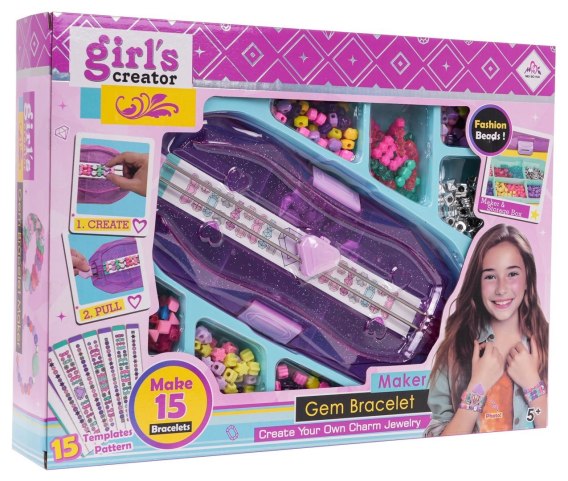 Kreatywny zestaw do robienia bransoletek dla dzieci powyżej 5-go roku życia. Z tym zestawem twoja pociecha stworzy swoje oryginalne bransoletki. W zestawie znajduje się ponad 400 kolorowych koralików oraz 15 wzorów bransoletek. Jest również maszynka do tworzenia bransoletek z pojemnikiem na akcesoria. Zrobienie swojej własnej bransoletki jest bardzo proste. Nawlekamy na dwa pręciki żyłkę, następnie nakładamy na nią koraliki, a następnie ściągamy z maszynki żyłkę z nawleczonymi koralikami. Bransoletkę możemy tworzyć na podstawie wzorników lub według własnego pomysłu.