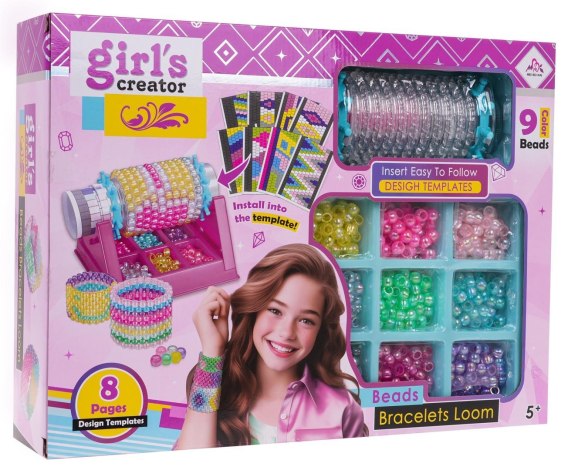 Zestaw do robienia bransoletek z krosnem i akcesoriami dla dzieci od 5-go roku życia. W zestawie znajduje się krosno, 8 wzorników oraz 540 koralików w 9 kolorach.Użycie krosna do bransoletek jest proste, wystarczy założyć plastikową tubę na podstawkę. Do podstawki wsypać koraliki, każdy kolor w osobnej przegródce, by było łatwiej. Wybieramy ze wzornika wzór, który mamy ochotę stworzyć lub wykonujemy bransoletkę według własnego pomysłu. Umieszczamy koraliki na tubie i zaczynamy tkać, rozpoczynając z prawej strony i przesuwamy się w lewo. Nitkę przewlekamy na zmianę góra, dół. Powtarzamy czynności na wszystkich rzędach koralików. Po skończeniu tkania zdejmujemy delikatnie bransoletkę z tuby. Zestaw rozwija zdolności manualne i kreatywność.