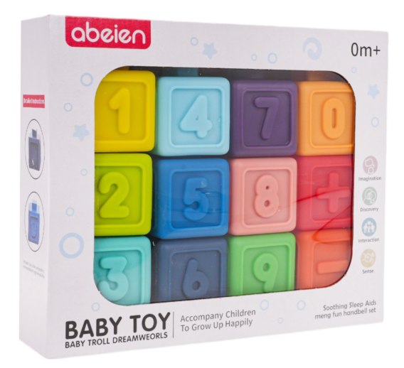 Zestaw gumowych, miękkich klocków sensorycznych z działaniami matematycznymi dla dzieci od pierwszych dni życia. Zestaw składa się z 12 klocków, z których maluszek może budować różne konstrukcje i uczyć się wykonywać proste działania matematyczne. Na każdym klocuszku umieszczonoróżne elementy takie jak: kształty, wzory, cyfry, obrazki zwierząt. Z tym zestawem dziecko uczy się dopasowywać, liczyć, rozróżniać kolory i kształty. Zabawa klockami stymuluje rozwój logicznego myślenia i motoryki małej. Klocki wykonane zostały z nietoksycznego materiału, gwarantują pełne bezpieczeństwo podczas zabawy.