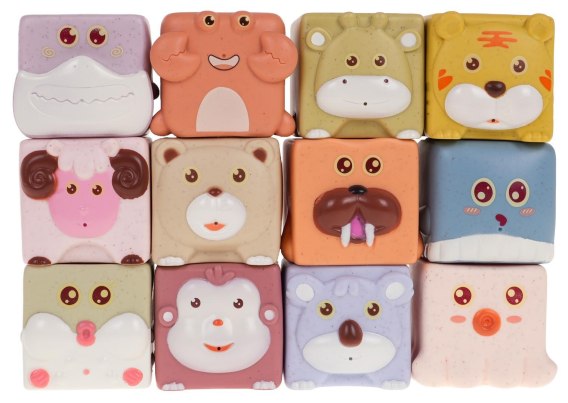 - 12 kostek ze zwierzątkami o różnych fakturach i kolorach: