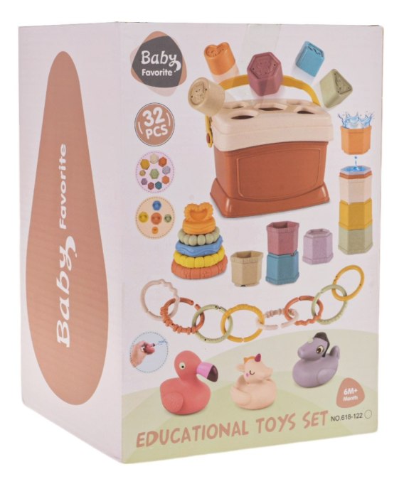 Zestaw kolorowych zabawek edukacyjnych dla maluszków od 6-go miesiąca życia. W skład zestawu wchodzi sorter kształtów z wygodną rączką do przenoszenia, klocuszki, gumowe zwierzaki, piramidki do układania wieży, okręgi konstrukcyjne i elementy do wpinania. Różnorodne kolory i kształty przyciągają wzrok maluszka i zachęcają do zabawy.
